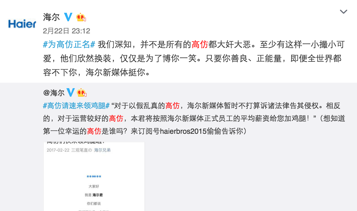 不知道從什么時候開始,平時刷微博時你會發現很多的高仿號,潛伏于各大評論中真假難辨。@海爾作為藍V總教頭,也遇見過很多海爾的高仿號,后來發現,其實這些高仿號是海爾的年輕用戶,他們想搶熱門,跟你的粉絲有效互動。面對這么一批可愛的小粉絲,@海爾沒有封殺,而是做官方聲明,只要你善良,且正能量,哪怕全世界都不管你我們呼喚你,甚至還給高仿號發福利。
